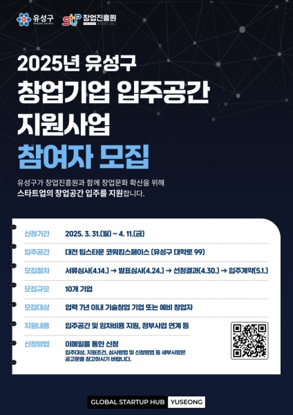 유성구는 지난 24일 창업진흥원과 지역 창업 생태계 활성화를 위한 업무협약을 체결했으며 협약에 따라 대전 팁스타운에 입주할 유망한 스타트업 기업을 모집한다.