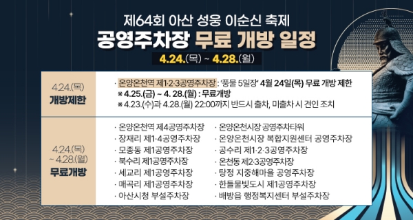다만, 4월 24일은 풍물 5일장으로 인해 온양온천역 제1~3공영주차장은 당일 22시까지 무료 개방 및 이용이 제한된다.