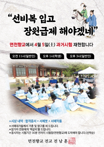 시험은 일반부와 학생부로 나뉘어 오전 11시, 오후 1시, 오후 3시 총 3회에 걸쳐 진행되며 면천향교의 고즈넉한 분위기 속에서 조선시대 시험의 전통을 고스란히 재현할 예정이다.