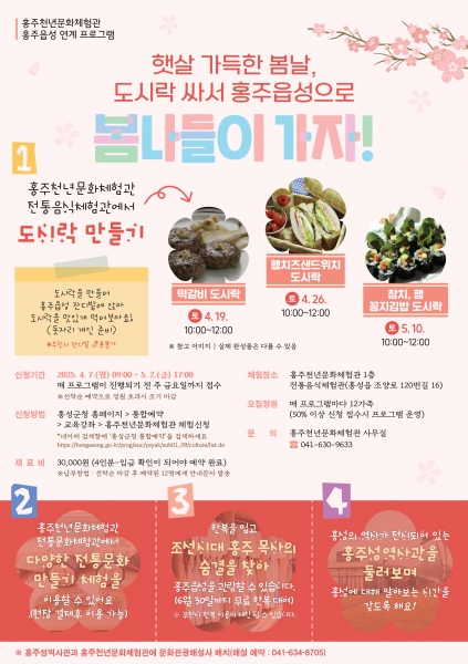 신청은 도시락 만들기 체험만 받으며 5월 2일까지 홍성군청 홈페이지’통합예약’ 교육강좌’홍주천년문화체험관 체험신청에서 선착순으로 진행된다.