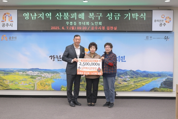 [Ytv영상스토리] 공주시는 지난 7일 시청 집현실에서 무릉동 부녀회와 노인회로부터 영남 지역 산불 피해 복구를 위한 성금 250만원을 전달받았다고 밝혔다.