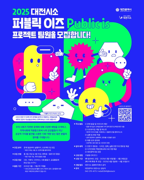 전재현 대전시 행정자치국장은 “퍼블릭이즈는 시민이 직접 제안하고 실현하는 새로운 정책 거버넌스 모델”이라며 “생활 속 문제를 함께 해결해 나가는 과정에 많은 시민의 관심과 참여를 바란다”고 말했다.