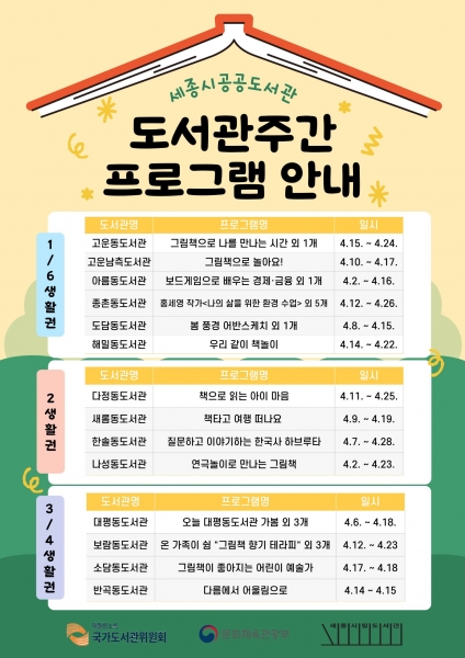 세종시립도서관 관계자는 “도서관 주간을 기념해 시민들의 관심사를 반영한 다양한 독서문화 프로그램을 준비했다”며 “이번 도서관 주간을 통해 시민들이 동네 공공도서관을 더욱 친숙하게 느끼고 꿈을 키우는 성장의 씨앗을 도서관에서 마련하는 계기가 되길 바란다”고 말했다.