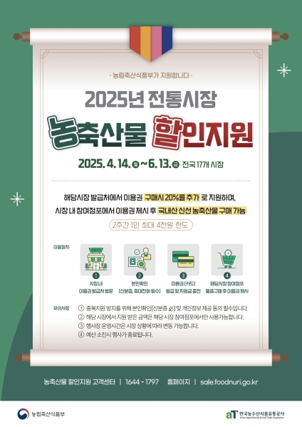 이번 사업은 전통시장을 방문하는 소비자들의 장바구니 부담을 줄이기 위해 오는 14일부터 6월 13일까지 약 2개월간 운영되며 국산 신선 농축산물을 20% 할인된 가격에 살 수 있는 이용권을 도마큰시장 고객센터에서 구매할 수 있다.