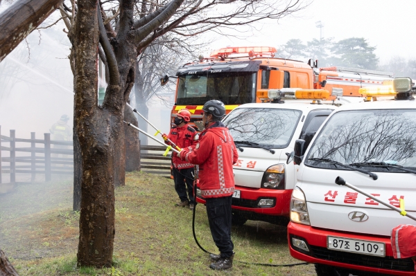 쓰레기소각 중 산불로 확산되는 상황을 가정해 기관별 대응 절차를 실제처럼 점검하고 상황판단회의를 통해 공동 대응 체계를 확인하는 방식으로 진행됐다.