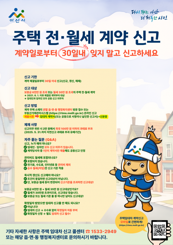 아산시, 주택 전·월세 계약 신고제 과태료 유예 종료 임박… “30일 내 신고 안 하면 과태료”