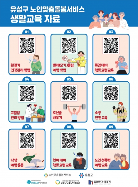 한편 유성구는 유성노인복지센터, 유성구남부노인복지관, 유성구노인복지관에서 사회참여 및 생활 지원 등을 제공하는 노인맞춤돌봄서비스를 운영 중이며 관련 상담은 주소지 관할 동 행정복지센터로 문의하면 된다.