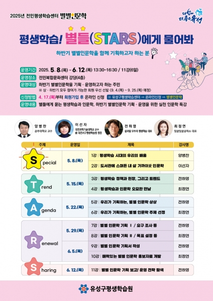 [Ytv영상스토리] 대전 유성구는 평생학습 전문가 4명을 초청해 평생학습과 인문학의 가치를 배우고 하반기 인문학을 직접 기획하는 ‘2025년 상반기 별별인문학- 평생학습 별들에게 물어봐’ 강좌를 개최한다.