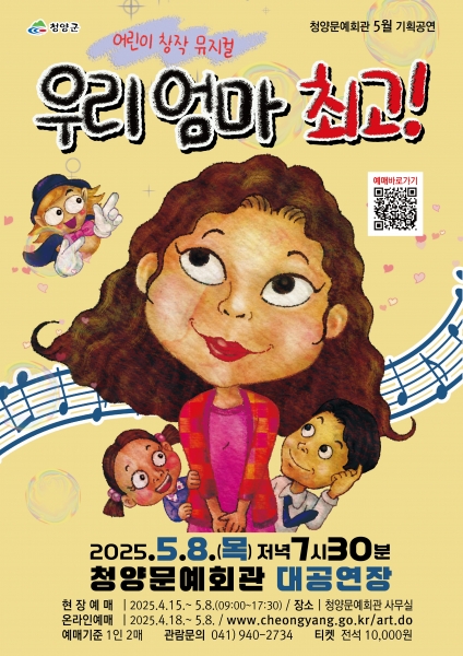 [Ytv영상스토리] 청양군이 가정의 달 5월을 맞아 어린이 가족 뮤지컬 ‘우리 엄마 최고’를 5월 8일 목요일 저녁 7시 30분 청양문예회관 대공연장에서 개최한다고 밝혔다.