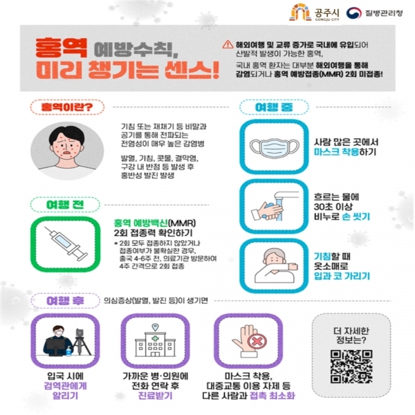 특히 최근 국내 홍역 환자 대부분이 해외에서 유입된 사례인 만큼 해외 방문을 계획하고 있는 시민들은 출국 전 반드시 예방접종을 완료하고 귀국 후 기침이나 열, 발진 등 호흡기 증상이 나타날 경우 의료기관에 해외 방문 사실을 알리고 진료받을 것을 당부했다.