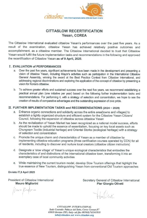 군 관계자는 “슬로시티의 궁극적인 목표는 지역 고유의 전통과 문화, 생태 자원을 활용해 지속 가능한 도시 발전과 군민 삶의 질 향상을 실현하는 데 있다”며 “이번 재인증을 계기로 모두가 찾고 싶은 예산형 슬로시티 조성에 더 힘쓰겠다”고 말했다.