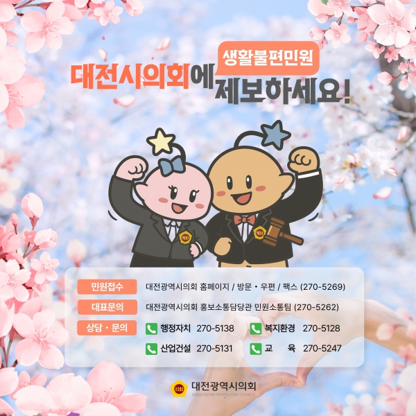 또한 시민들이 불편을 겪을 때 언제든 대전광역시의회를 떠올리도록 사회관계망서비스를 통해 연중 수시 홍보를 확대할 예정이다.