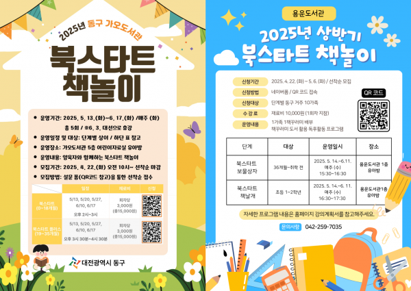 [Ytv영상스토리] 대전 동구는 다음 달 13일부터 가오도서관과 용운도서관에서 ‘2025년 상반기 북스타트 책놀이’를 운영한다고 21일 밝혔다.