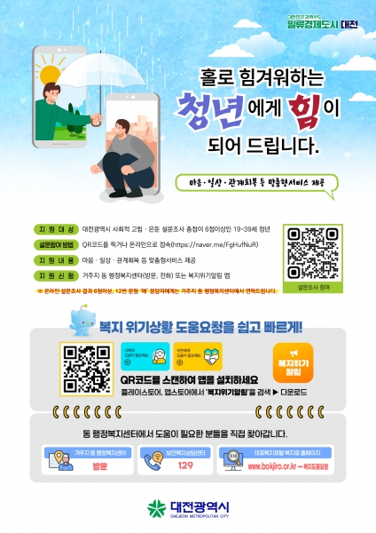 대전시는 청년센터, 사회복지관, 청년 밀집 원룸촌, 대학가 등 주요 거점에 QR코드가 삽입된 홍보 포스터 및 전단을 집중 배포하는 한편 SNS 및 청년 커뮤니티 등을 통한 온라인 홍보 캠페인도 적극 병행할 계획이다.