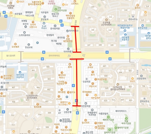 한편 도안마을1단지 아파트와 현대자동차를 연결하는 횡단보도는 국토교통부 교통영향평가 결과에 따라 폐지되지만, 해당 구간에 트램 정거장이 설치될 예정으로 보행자 편의는 오히려 향상될 것으로 기대된다.