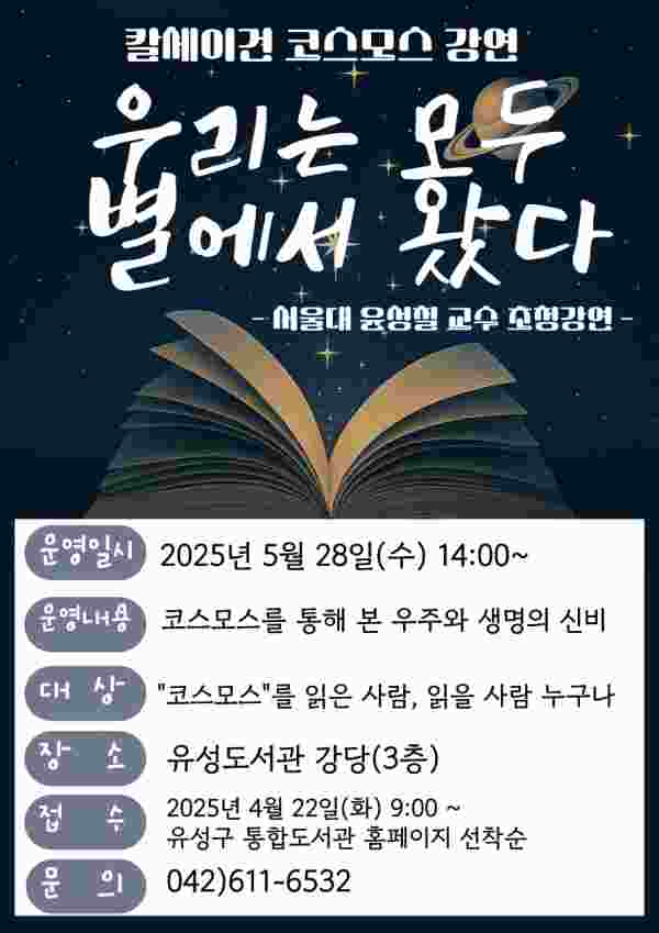 이번 강연은 유성도서관의 독서동아리 ‘벽돌책 독파단’ 이 함께 읽은 칼 세이건의 ‘코스모스’를 이해하기 위해 윤성철 서울대 물리천문학부 교수를 초청해 의미를 되새기는 시간으로 진행된다.