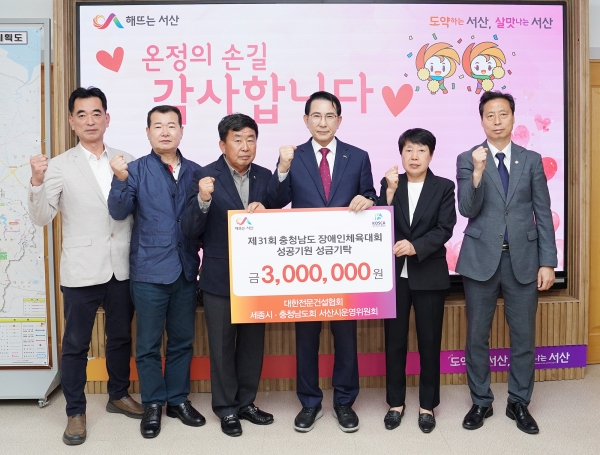 시는 이날 시청 시장실에서 이완섭 서산시장, 안연길 대한전문건설협회 서산시운영위원회 위원장, 가봉진 서산시 장애인 체육회 수석부회장 등이 참석한 가운데 기탁식을 개최했다.