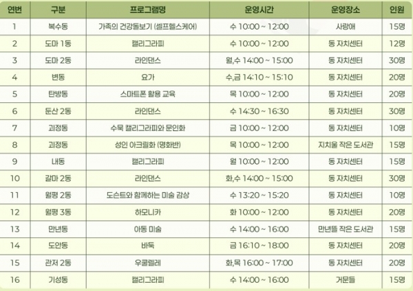 동 평생학습센터 프로그램은 동 자치센터, 작은도서관 등 유휴공간을 학습공간으로 활용해 주민들이 가까운 곳에서 다양한 교육에 참여할 수 있도록 운영되고 있다.