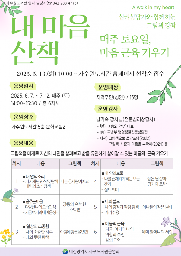 내 마음 산책은 심리상담사와 함께하는 그림책 강좌 방식으로 진행되며 6월 7일부터 7월 12일까지 매주 토요일 오후 2시 도서관 5층에 있는 2번 문화교실에서 총 6차시로 운영 예정이다.