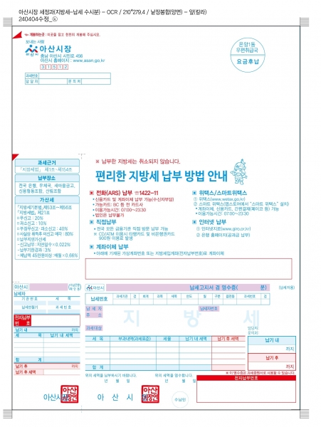 또한, ‘지방세 간편 상담 챗봇 QR코드’를 삽입해 상황별 지방세 상담과 세목별 기본적인 문의를 빠르고 쉽게 확인할 수 있도록 개선하고 시정 홍보를 위해 ‘2025~2026 충남·아산 방문의 해’ 슬로건도 배치했다.