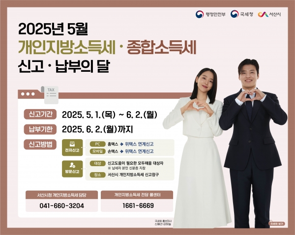 개인지방소득세·종합소득세 신고에 대한 자세한 사항은 서산시 세정과 또는 관련 전담 콜센터에 문의하면 된다.