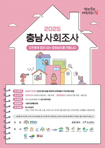 인터넷 조사는 5월 9일부터 5월 20일까지 충남도 사회조사 홈페이지 에서 참여 가능하다군 관계자는 “충남 사회조사는 지역주민의 삶과 직결된 사회적 상태를 측정해 군민과 지역의 미래 발전을 위한 정책을 수립하는 데 중요한 빅데이터 자료를 확보하기 위해 추진되고 있다”며 “대상가구의 적극적인 참여와 성실한 답변을 부탁드린다”고 말했다.