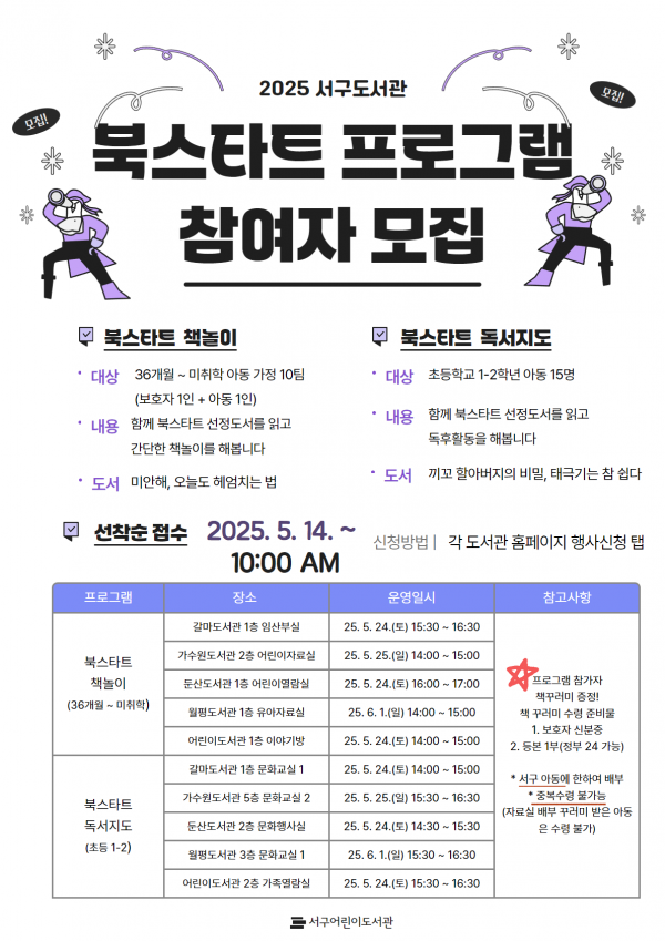 관별 진행 날짜 등 기타 자세한 내용은 홈페이지 공지사항을 확인하거나, 갈마·가수원·둔산·월평도서관·서구어린이도서관으로 문의하면 된다.