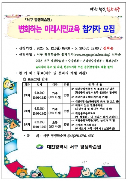 [Ytv영상스토리] 대전 서구 평생학습원은 민주시민교육의 일환으로‘2025년 변화하는 미래시민교육’ 참가자를 5월 12일부터 30일까지 모집한다고 밝혔다.