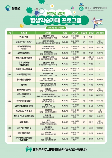 운영강좌의 세부 내용은 홍성군평생학습관 홈페이지에서 확인 가능하며 기타 문의사항은 신도시평생학습관로 문의하면 된다.