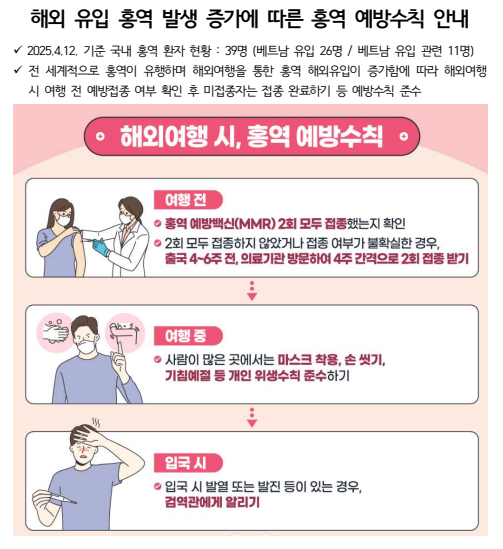 해외여행 4~6주 전 홍역 예방백신을 2회 접종해야 하며 여행 중 사람이 많은 곳에서는 마스크 착용, 손 씻기, 기침예절 등 개인위생 수칙을 준수해야 한다.