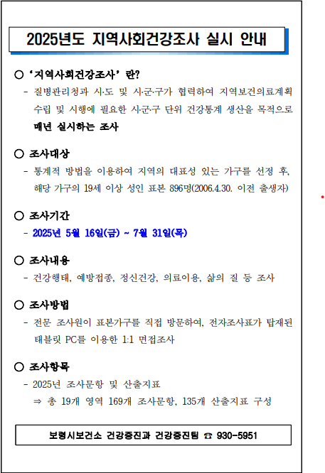 [Ytv영상스토리] 보령시는 지역사회 건강실태 파악을 위해 5월 16일부터 7월 31일까지 2025년 지역사회건강조사를 실시한다고 밝혔다.