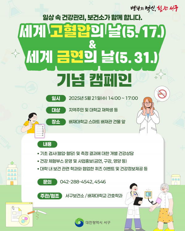 [Ytv영상스토리] 대전 서구는 매년 5월 17일 세계 고혈압의 날과 5월 31일 세계 금연의 날을 기념해, 고혈압 예방 및 금연의 중요성을 알리기 위한 캠페인을 오는 21일 오후 2시~5시까지 배재대학교 스마트배재관 앞에서 진행한다.