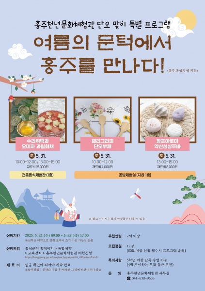 신청은 오는 21일부터 23일까지 홍성군청 홈페이지’통합예약’ 교육강좌’홍주천년문화체험관 체험신청에서 선착순으로 진행되며 체험비는 무료이나 프로그램 운영에 따른 재료비는 참가자가 부담해야 한다.