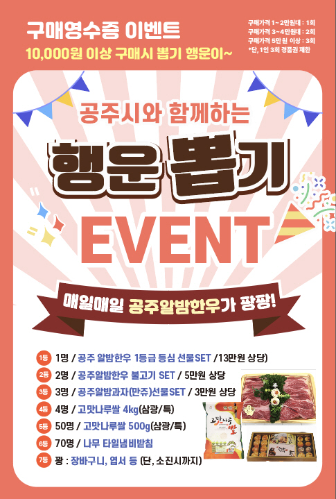 특히 행사 기간 동안 1만원 이상 구매한 방문객에게는 공주알밤한우 선물꾸러미, 고맛나루쌀, 공주알밤과자 꾸러미 등을 증정하는 ‘통 큰 행운 뽑기’ 이벤트도 마련돼 눈길을 끈다.