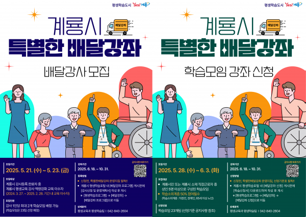 [Ytv영상스토리] 계룡시는 21일부터 23일까지 ‘2025년 특별한 배달강좌’ 운영을 위한 강사를 공개 모집한다고 밝혔다.