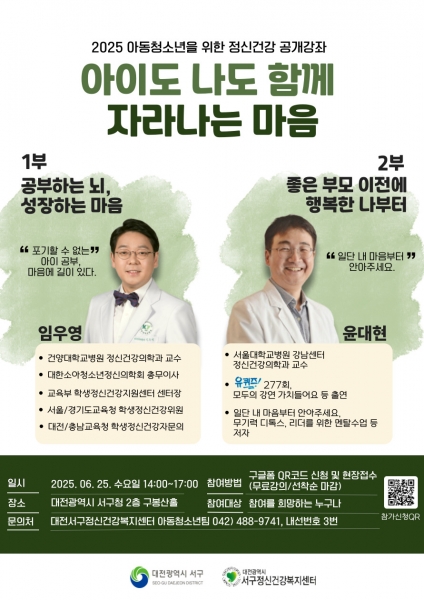 [Ytv영상스토리] 대전 서구 정신건강복지센터는 오는 6월 25일 서구청 구봉산홀에서 ‘아이도 나도 함께 자라는 마음’ 이라는 주제로 아동·청소년을 위한 정신건강 공개강좌를 개최한다고 전했다.
