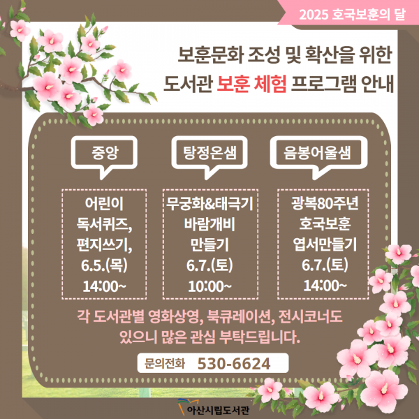 주요 프로그램은 호국영웅과 국가의 의미를 되새길 수 있는 △영화상영 △북큐레이션 △전시 △온라인 사진전 등이며 △중앙도서관 ‘어린이 독서퀴즈’ △탕정온샘도서관 ‘무궁화·태극기 바람개비 만들기’ △음봉어울샘도서관 ‘광복 80주년 호국보훈 엽서 만들기’ 등 다양한 체험 프로그램도 운영된다.