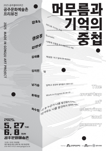 한편 이번 전시는 공주 왕도심 내 갤러리와 공공기관이 함께하는 ‘2025 공주갤러리주간’과 연계되어 진행되며 공주 왕도심을 예술로 가득 채우는 문화예술 행사로 시민들에게 보다 다양한 문화예술 체험의 기회를 제공한다.
