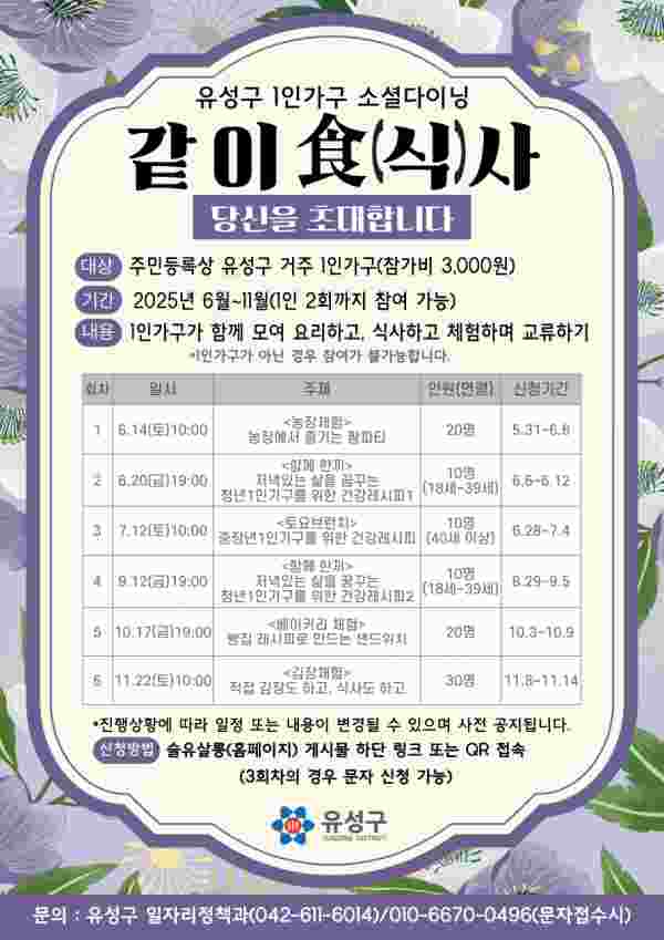 참여 대상은 유성구 거주 1인 가구로 회차별 10명을 모집하고 1인당 최대 2회까지 참여할 수 있다.