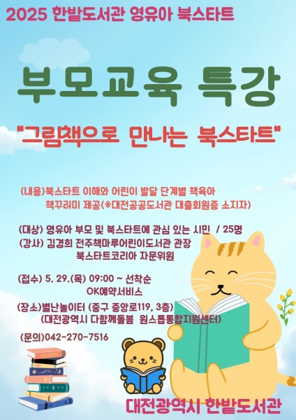 김혜정 한밭도서관장은 “이번 북스타트 사업이 영유아들이 책과 친해지는 계기가 되고 부모와 함께 소중한 추억을 쌓으며 평생 독서의 기초를 다지는 뜻깊은 경험이 되기를 기대한다”고 말했다.