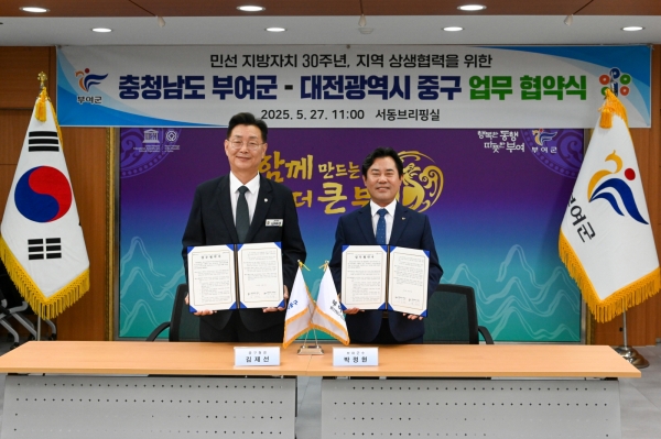 [Ytv영상스토리] 부여군과 대전광역시 중구가 지난 27일 부여군청 서동브리핑실에서 민선 지방자치 30주년을 맞아 공동 지역발전 전략 추진을 위한 업무협약을 체결했다.