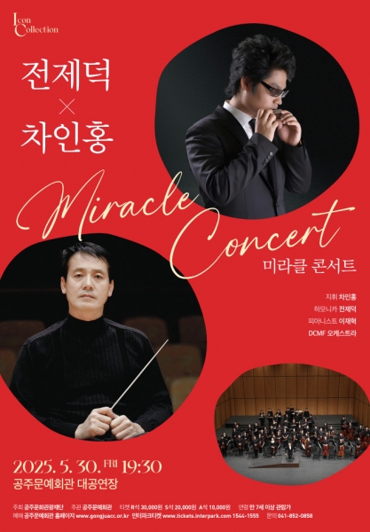 이번 공연은 국내 유일의 재즈 하모니카 연주자 전제덕과 휠체어 위의 마에스트로 차인홍이 지휘하는 DCMF 오케스트라, 그리고 시각의 한계를 넘어선 피아니스트 이재혁이 함께 만드는 기적 같은 무대로 공주시민들에게 잊지 못할 감동과 희망을 선사할 예정이다.