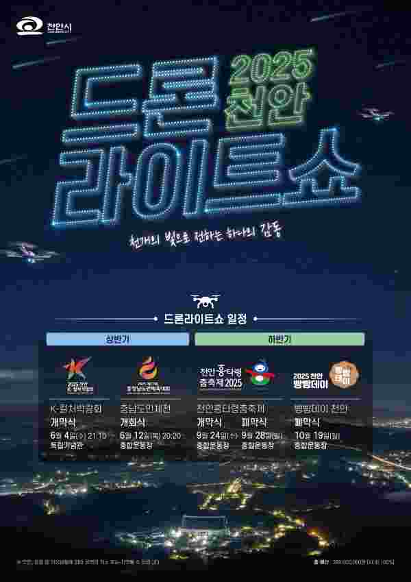 시는 야간 콘텐츠 강화를 위해 다음달 4일 열리는 2025 천안 K-컬처박람회 개막식을 시작으로 제77회 충남도민체육대회 개회식, 천안흥타령춤축제 개막식·폐막식, 빵빵데이 폐막식 등 5회에 걸쳐 드론라이트쇼를 진행한다.
