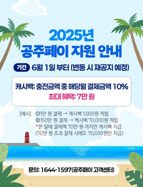 이에 따라 충전일과 관계없이 월 70만원 한도 내에서 해당 월에 공주페이로 결제한 금액 중 10%의 캐시백이 적용되며 최대 7만원까지 혜택을 받을 수 있다.