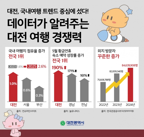 또한 한국관광공사의 2024년 지역별 방문객 통계에 따르면, 대전 방문객은 총 8,463만여명으로 전년 대비 3.1% 증가했다.