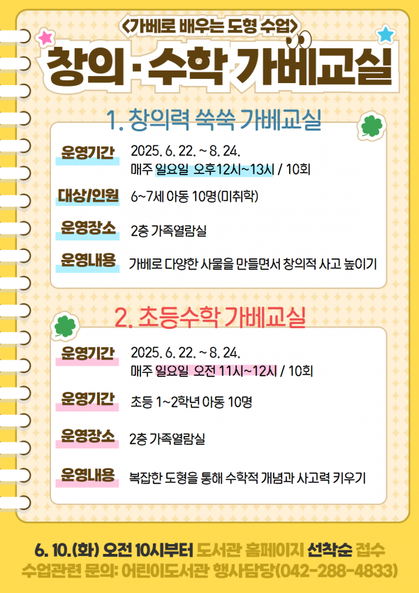 수업은 정림동에 있는 서구 어린이도서관에서 진행되며 수강인원은 강좌별로 10명씩 선착순 모집한다.
