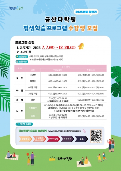 금산다락원 2025년 하반기 평생학습 프로그램 수강생 모집에 관한 자세한 내용은 금산다락원 누리집 또는 금산평생학습포털에서 확인할 수 있다.