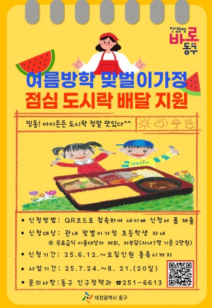 [Ytv영상스토리] 대전 동구는 여름방학 기간 맞벌이 가정의 초등학생 자녀를 위한 점심 도시락 배달 지원사업 ‘띵동 아이든든 도시락’을 본격 추진하며 이달 12일부터 참여 신청을 받는다고 밝혔다.