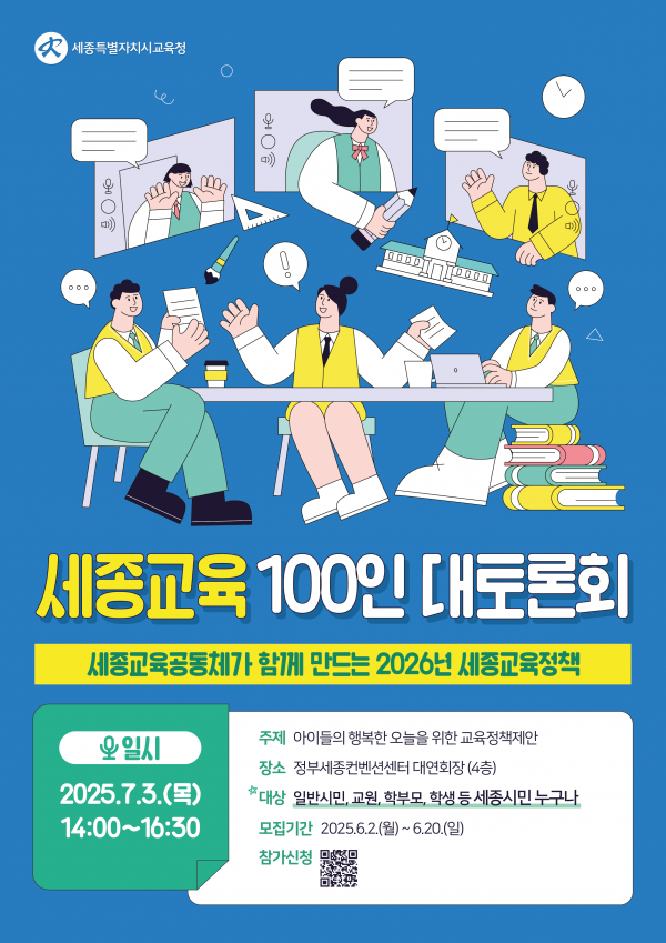 참가 신청은 6월 2일부터 6월 20일까지 ‘세종교육 100인 대토론회’ 홍보 포스터와 카드뉴스에 제시된 QR코드를 인식해 할 수 있다.