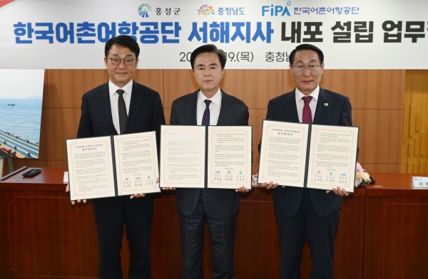 이날 협약식에는 김태흠 도지사, 이용록 홍성군수, 홍종욱 한국어촌어항공단 이사장이 참석해, 서해지사 설립과 그에 따른 제반 사항의 지원을 담은 3개 기관의 역할에 합의하고 협약서에 서명했다.